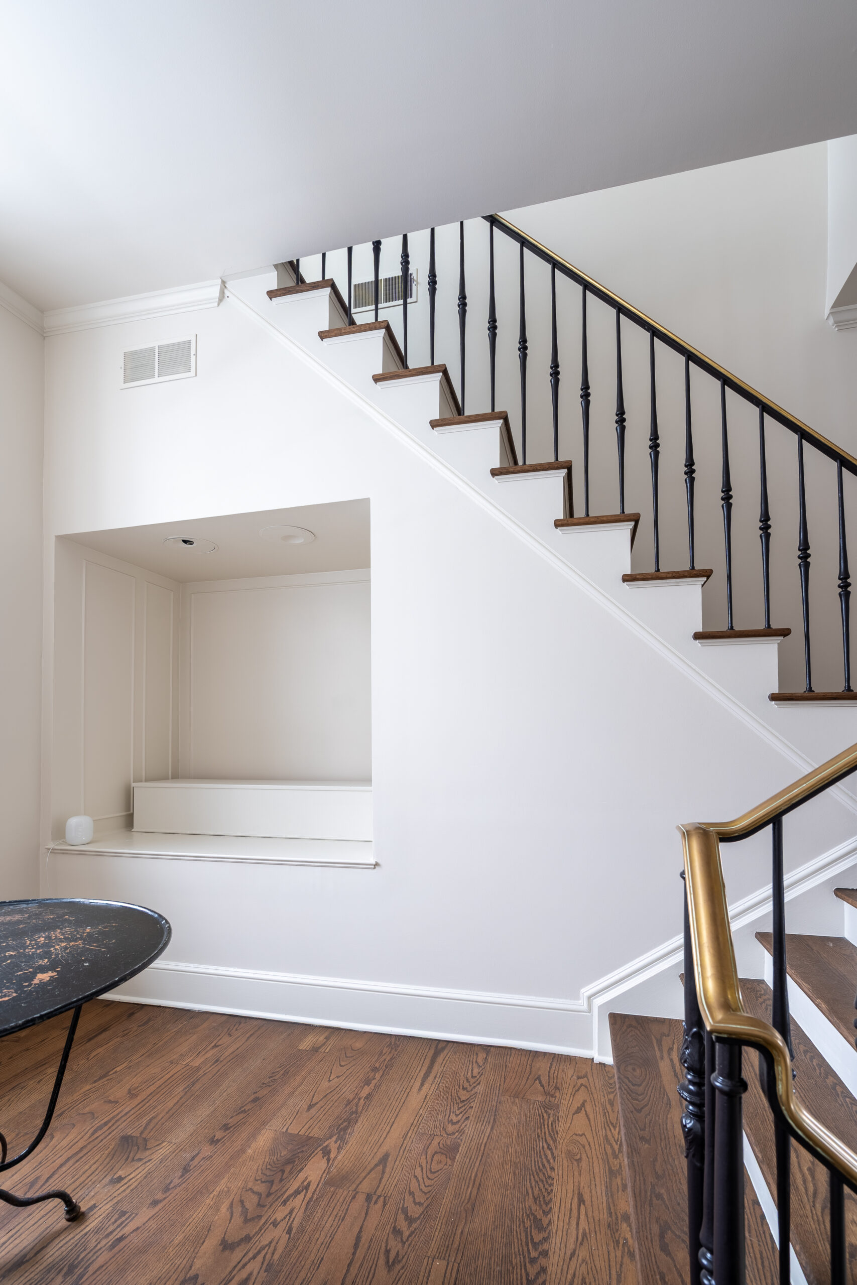 The woodwork, once worn and inconsistent, now looks crisp and intentional. Balusters and risers stand out in the best way, adding structure without visual clutter. The ceilings, walls, and doors work together as a single, refined design rather than competing elements.